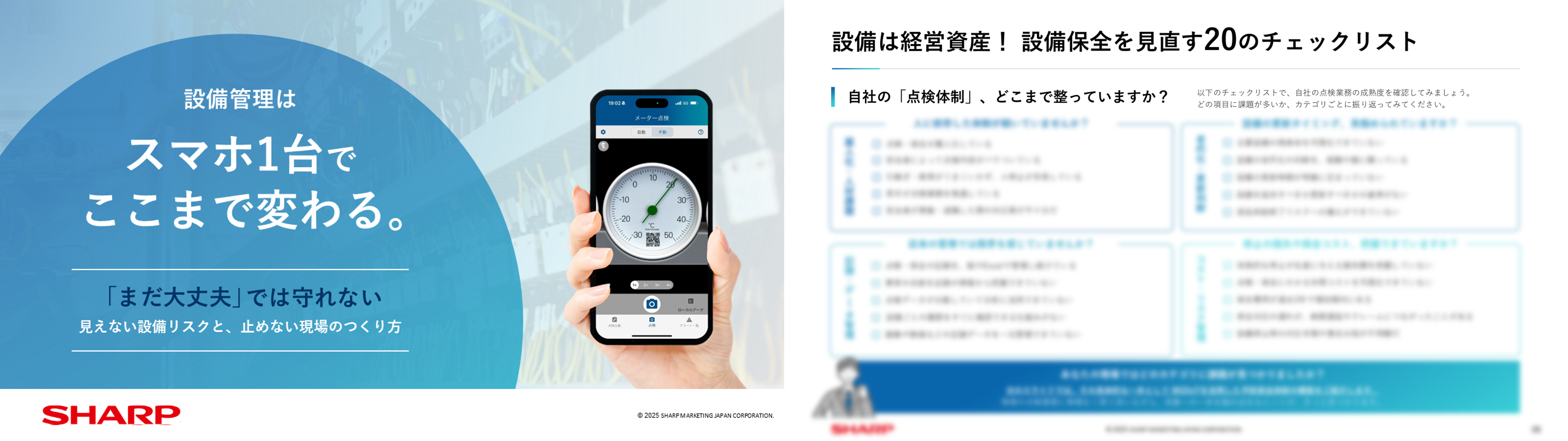 資料ダウンロード 老朽設備の「見えないリスク」を見える化する。スマホ1台で始める、予防保全の強化策。 老朽設備の「まだ動くから大丈夫」をそのままにしていませんか? この資料では、設備点検データの活用による経済的メリットや、現場の設備保全体制を見直すのに役立つ20項目のチェックリスト等を掲載しています。 予防保全の強化に向けた第一歩として、「点検記録のデジタル化」の価値をわかりやすく解説しています。 「止まらない現場」を実現するためのヒントを手に入れましょう。
